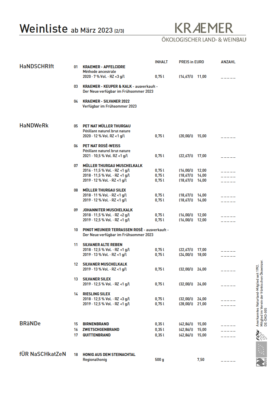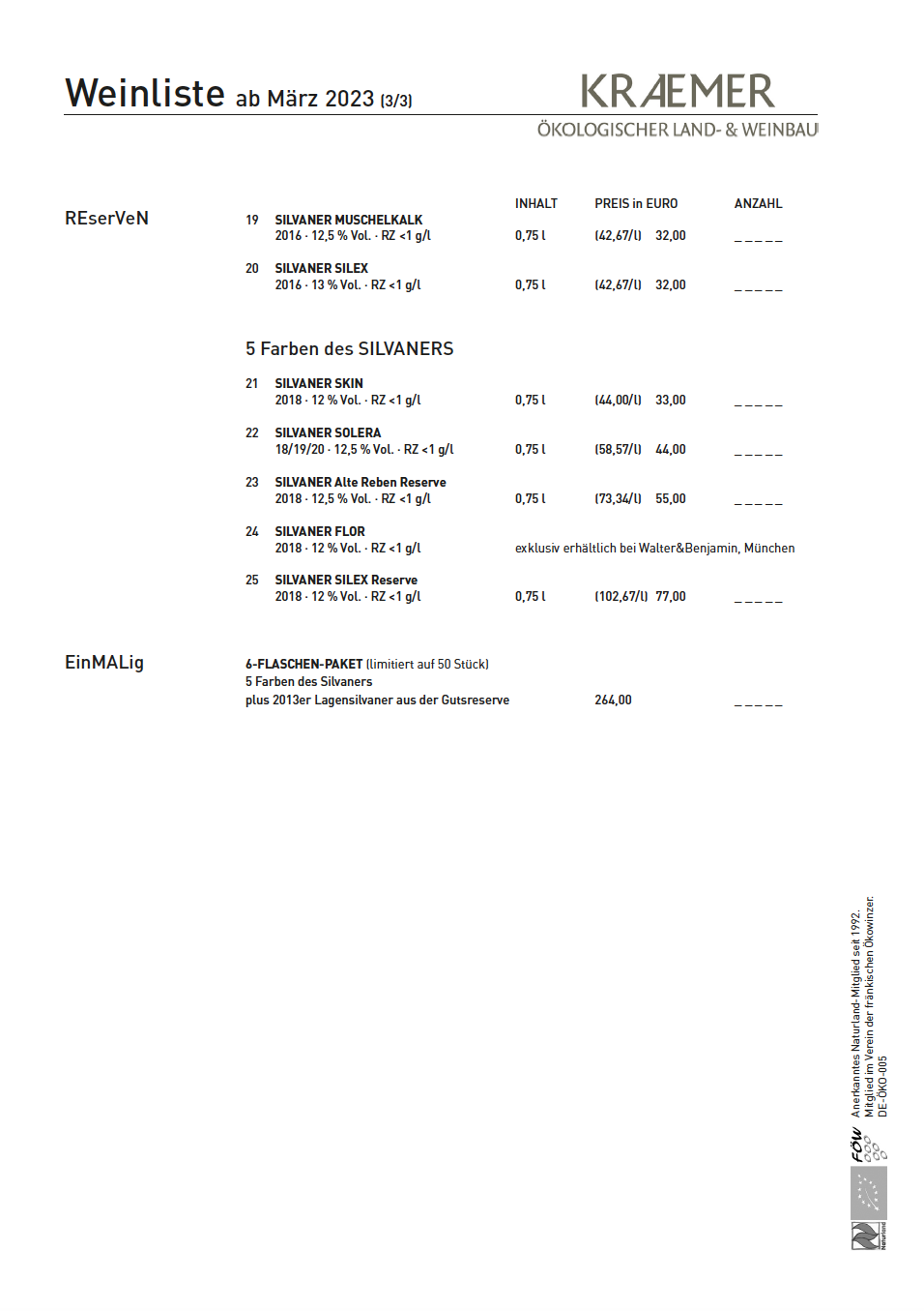 Anerkanntes Naturland-Mitglied seit 1992. Mitglied im Verein der Fränkischen Ökowinzer.